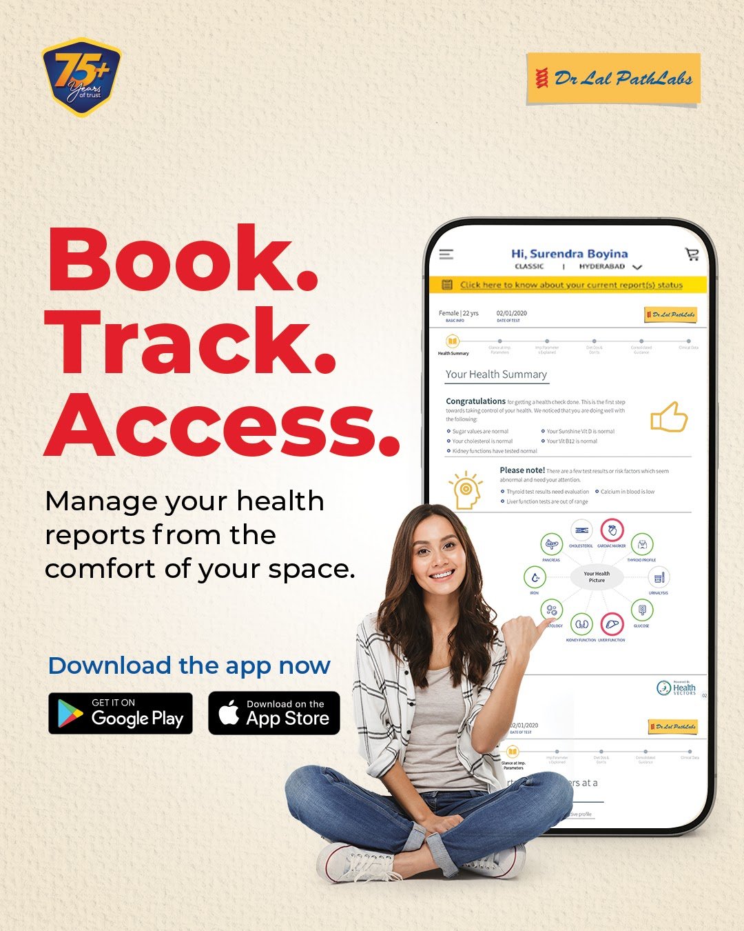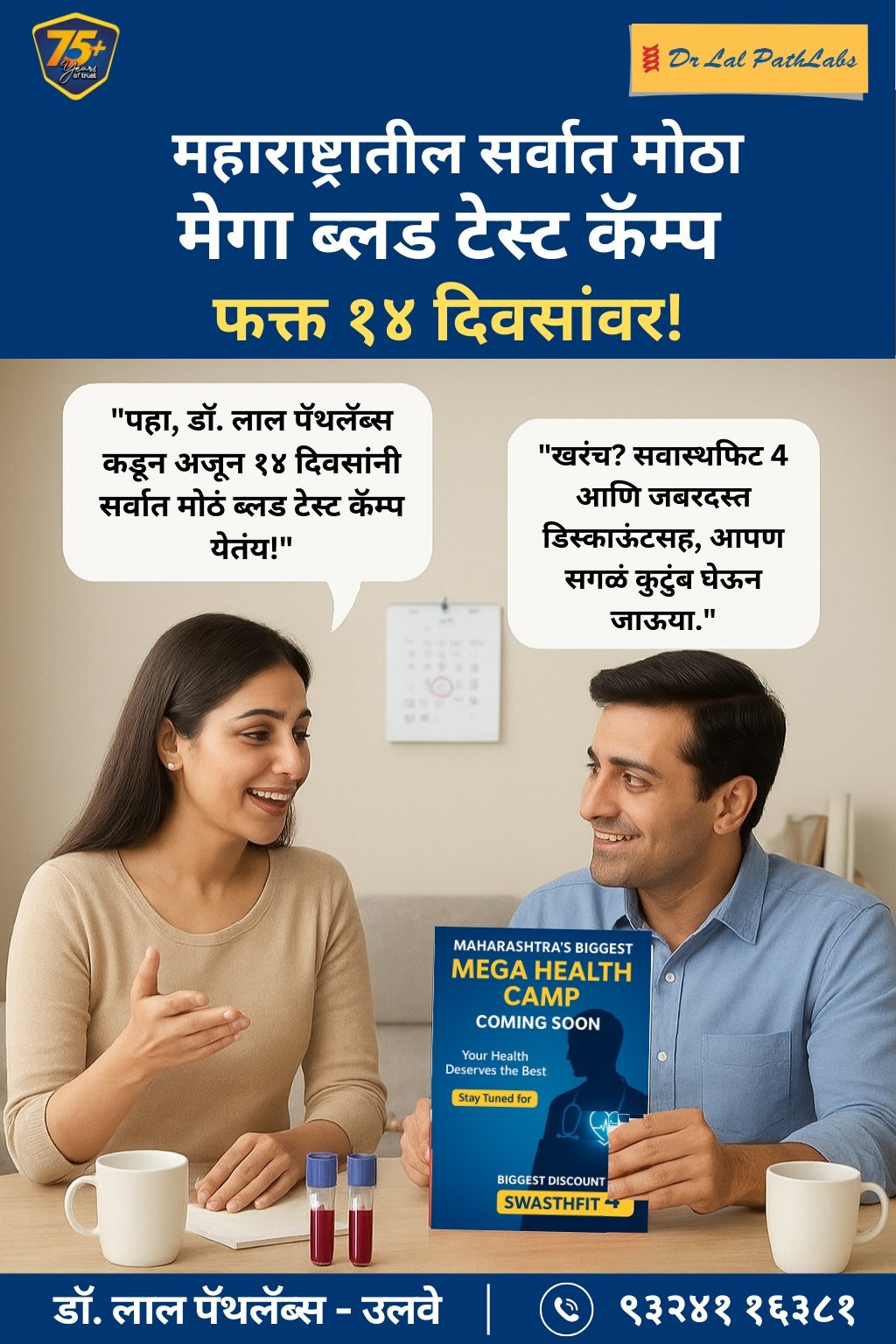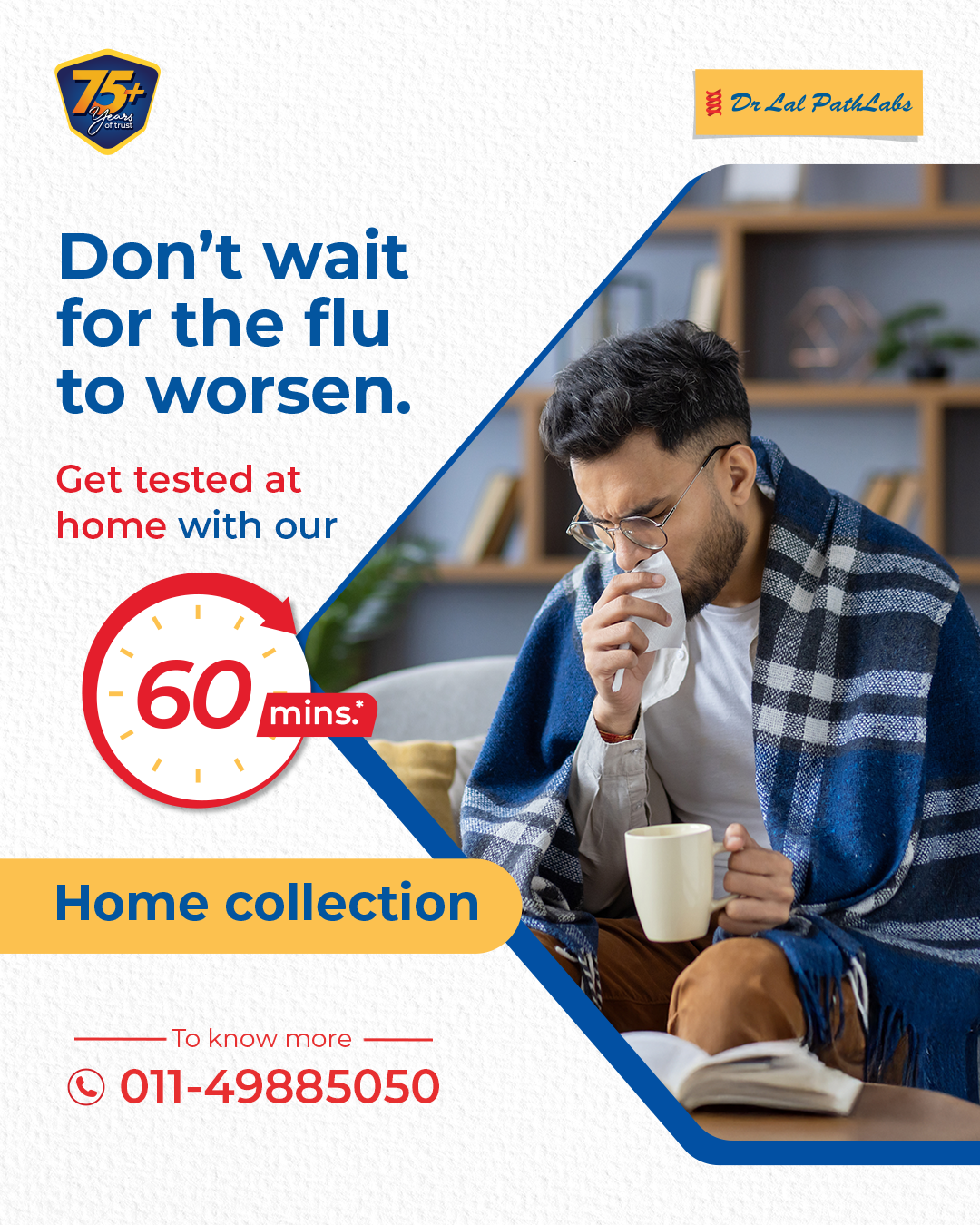 Dr Lal PathLabs, India's leading diagnostic chain with 75 years of expertise, offers 5000+ tests, including CBC, Blood Sugar, HbA1c, Kidney/Liver Function, Thyroid, Lipid, Vitamin D/B12, Urine Culture, Allergy tests, and full-body packages. With 150+ hospital partnerships, 280+ labs, 6000+ patient service centers, and 11,000+ pickup points, it ensures accessible, affordable, timely, and high-quality services. Our range of health packages - Swasthfit provides age-specific and advanced panels for non-communicable diseases like diabetes and heart ailments.